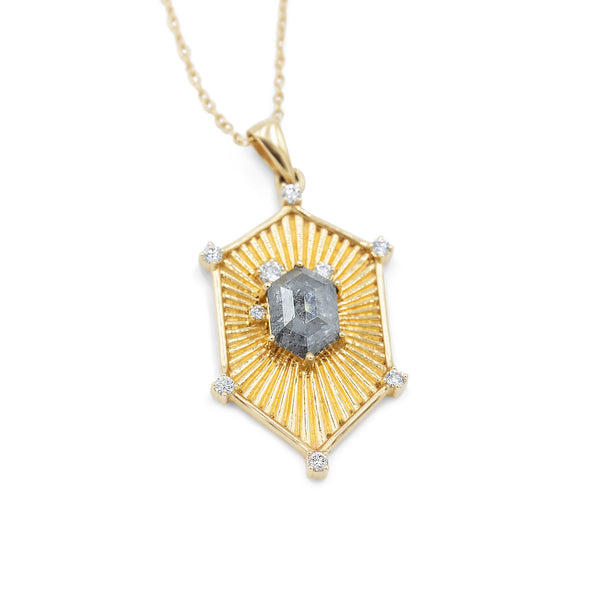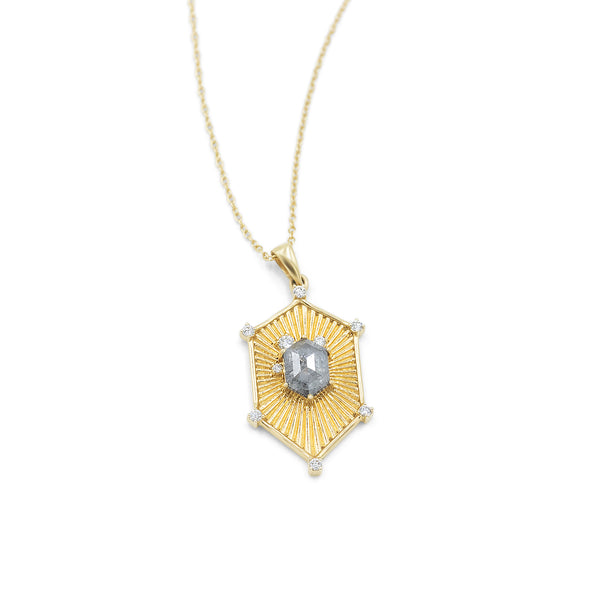 Design: This shield-shaped pendant crafted in 18k gold designed to resemble an ancient shield but with a modern twist.  Radiating lines extend from the center stone outward, enhancing its presence and giving the pendant a dynamic and captivating appearance. The overall effect is one of strength and elegance, blending historical inspiration with contemporary design.