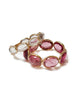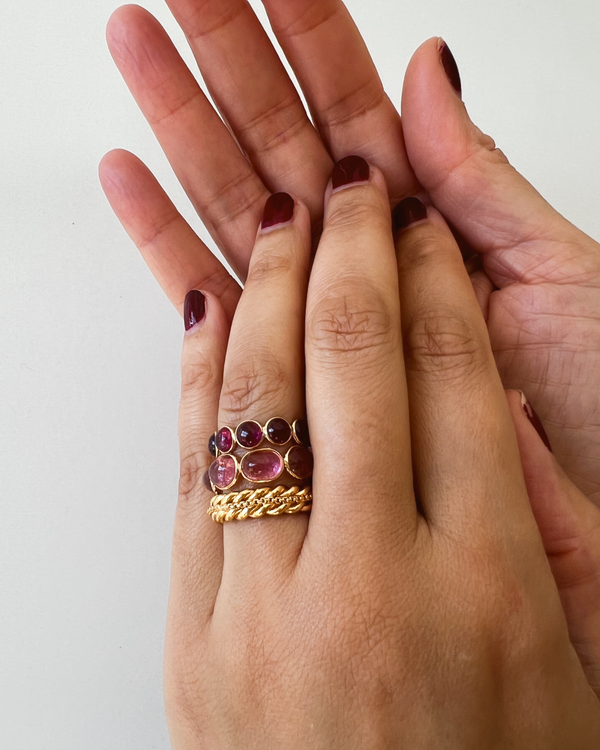 Dorian's Find: This Aura ring in rubellite is another one of our charming vintage finds. Cheerful and warm, this 18k spectacle set design features large oval cabochon rubellite stones that vary from deep pink to mauve. The stones have several visible inclusions but we find this adds a lot of depth and individuality to each stone.