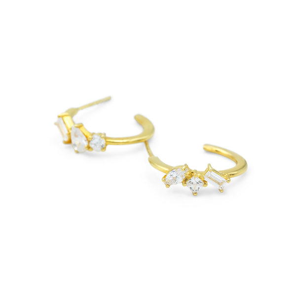 Design:  These diamond hoop earrings are far from ordinary. Featuring three different shaped diamonds, they radiate light and elegance effortlessly.  The design aims to capture and reflect light in various ways, enhancing the wearer's natural beauty with a touch of understated luxury. The intentional choice of mixed diamond shapes not only adds visual interest but also symbolizes diversity and individuality.