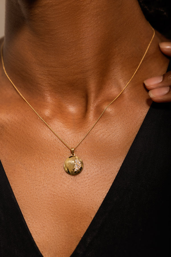 Design: White diamonds are sprinkled across the smooth surface of this lightly domed pendant.
