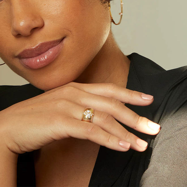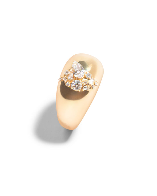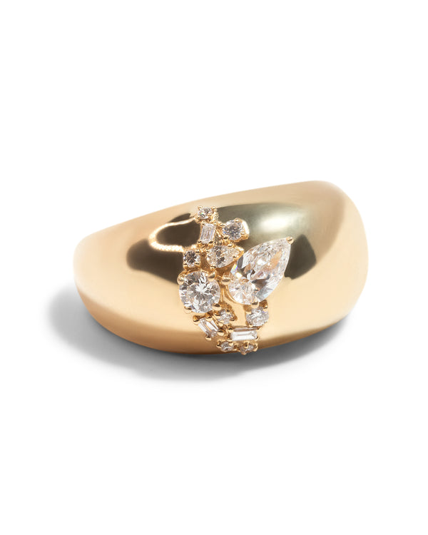 Design: The asymmetric placement of fancy cut diamonds in this liquid smooth dome ring elevates it above all others. Imagine the journey involved in sourcing each particular diamond shape to add visual interest to this elegant composition. Enjoy the distinct personality of each gemstone as it blazes its own path.