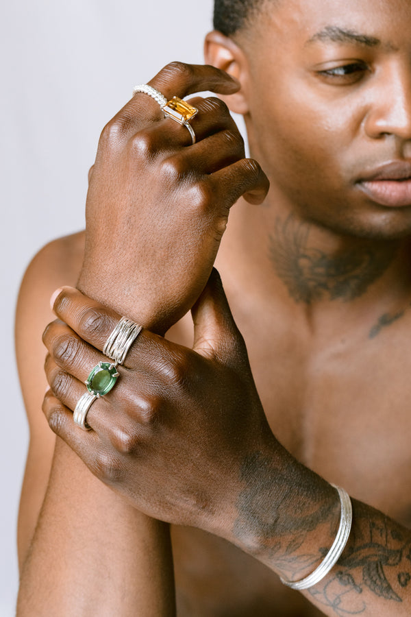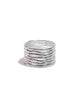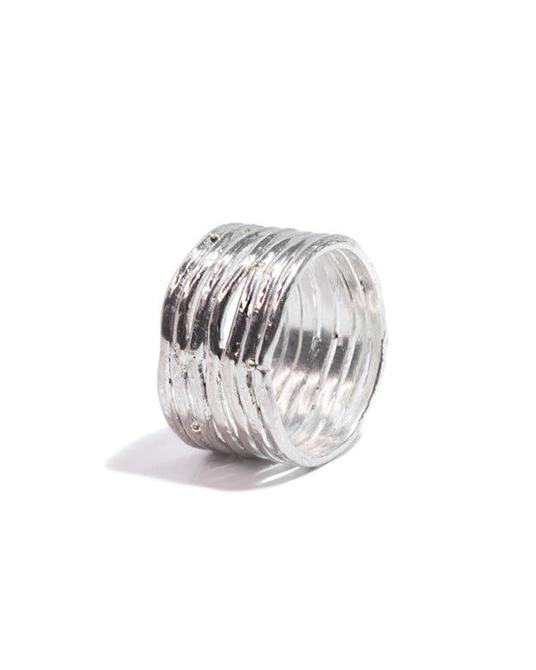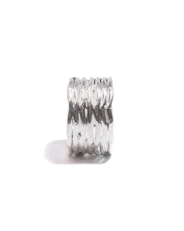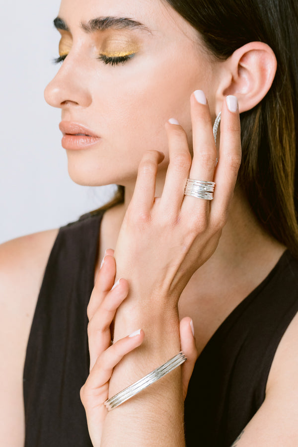 Design: What is present as just as important as what isn’t; 7 rows of shimmering silver wrap around but not-quite-overlap your finger, revealing glimpses of skin beneath. Sterling silver granules accent curves and catch light.