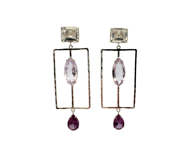 Design: Framed by hammered sterling silver, these earrings feature the quiet beauty of cape amethyst. The elongated marquis shape is accented emerald cut white topaz and teardrops of spinel quartz, creating a waterfall of color.