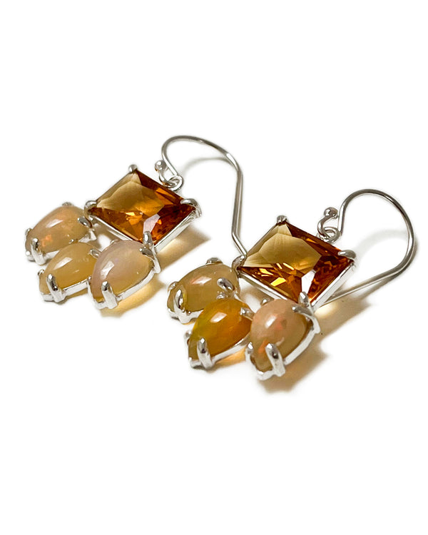 Design: Emerald cut orange quartz stabilizes three small, smooth opals on these charming dangle earrings.