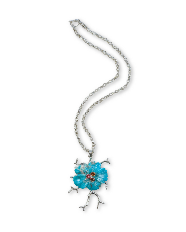 Design: Evoking the windswept beauty of the California coastline and the resilient blooms that cling to its cliffs, this pendant showcases a hand-carved turquoise flower brought to life with vibrant orange topaz accents. Resting on sculptural, coral-inspired branches and suspended from a delicately textured chain, it’s a captivating blend of natural elegance and organic form. Wear it as a striking reminder of nature’s quiet strength—and the unexpected places where beauty takes root.