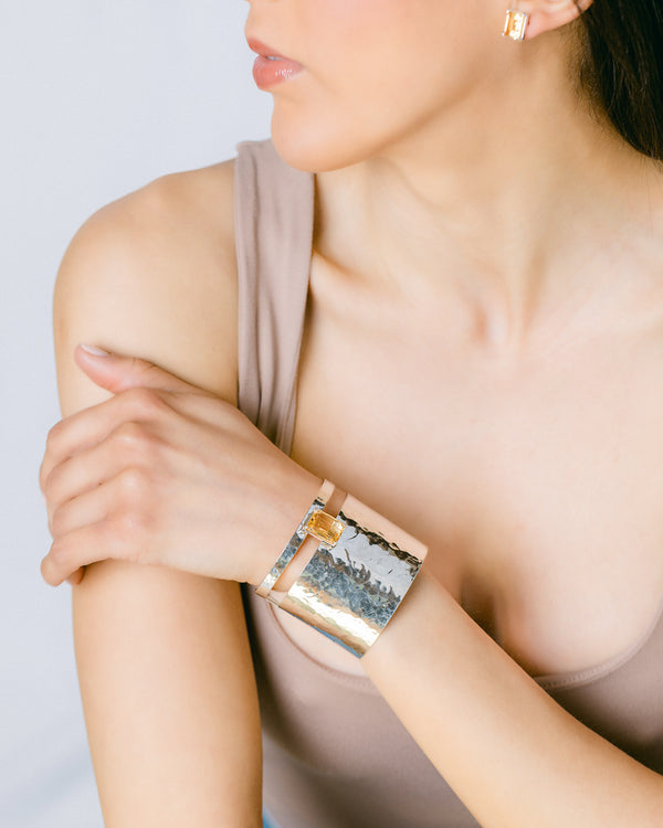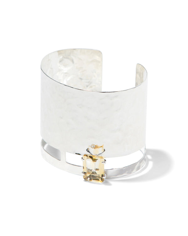 Design: Sexy and bold, this cuff leaves nothing to chance. Its simple lines are accented with a carefully hammered surface, and an off set sparkling, emerald cut citrine.