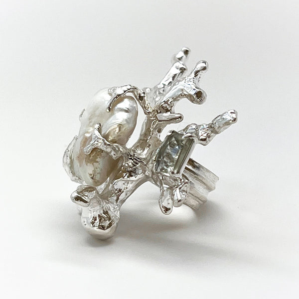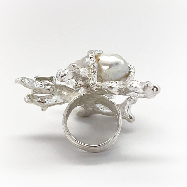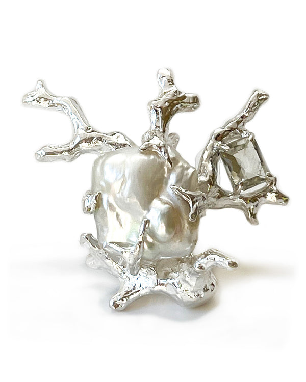 Design: The epitome of the expression "conversation piece", this pearl and prasiolie ring draws immediate attention whenever it is worn. Inspired by the natural forms of coral, it isn't shy about reaching across the expanse of neighboring fingers to proffer its treasure to the world. Perhaps there is a lesson to be learned from the coral in fearlessly taking up space...