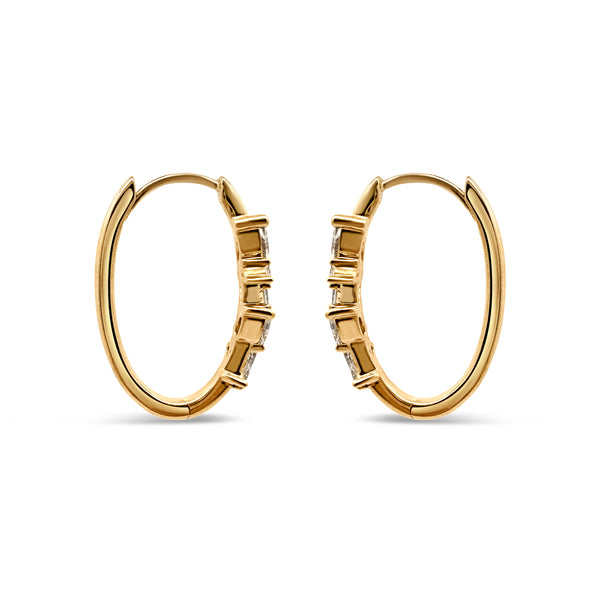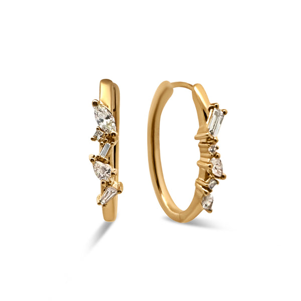 Design: These graceful gold huggie hoops are adorned with an artful cascade of diamonds in mixed cuts creating a dynamic play of light and shape. The asymmetrical arrangement lends them a modern, sculptural feel, while their delicate scale makes them effortlessly wearable from day to night.