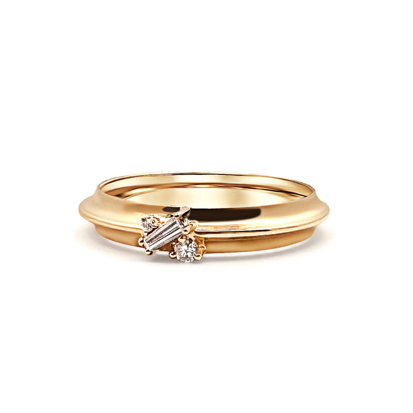 Design: A study in clean lines and modern elegance, this gold band features a sleek baguette diamond paired with two brilliant cut diamonds. The contrast in shapes adds quiet sophistication, making it a versatile piece for both contemporary and classic stacks.