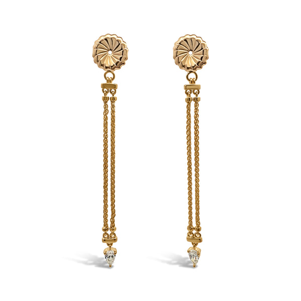 Design: A celebration of movement and light, these earring tassels feature gold foxtail chains that fall in delicate strands culminating in a pear shaped natural diamond. Their fluid motion catches the light with every turn of the head, adding an irresistible sense of elegance and energy. Perfect for making an impression that lingers.
