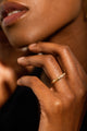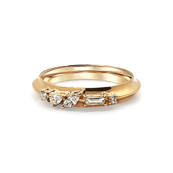 Design: A celebration of light and form, this gold band features an artful cluster of diamonds in a striking mix of cuts. The varied shapes play off each other in a dynamic composition, creating a look that’s both intricate and effortlessly elegant. Perfect for anchoring a stack or shining on its own.