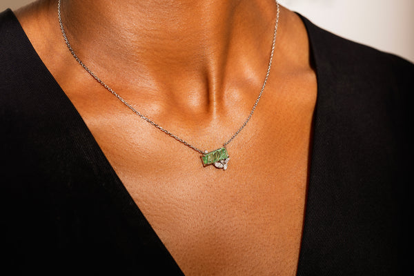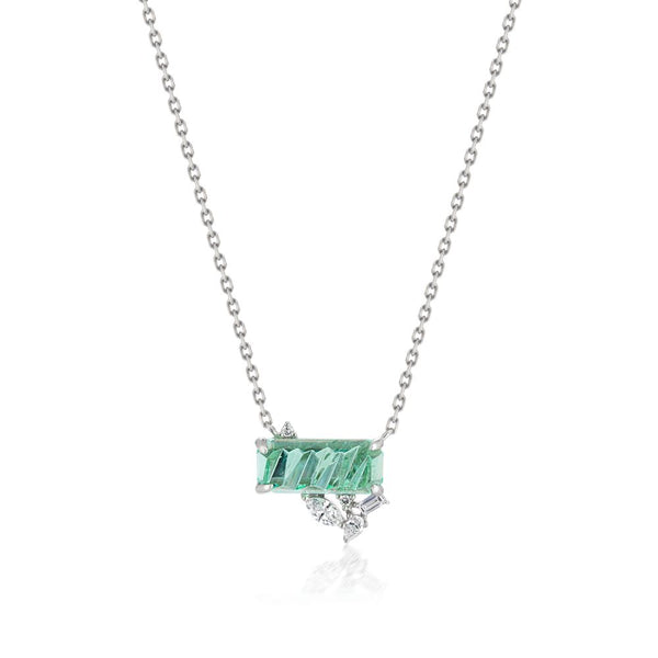Design: Less than 2% of all paraiba tourmaline mined are cut into fancy shapes. We were lucky to get our hands on one of them! The unusual waffle cut of the paraiba we selected for this necklace magnifies its peppermint color, and its lozenge shape reflects it even further. Accented by a sprinkling of fancy cut diamonds, this is the necklace you will reach for again and again...