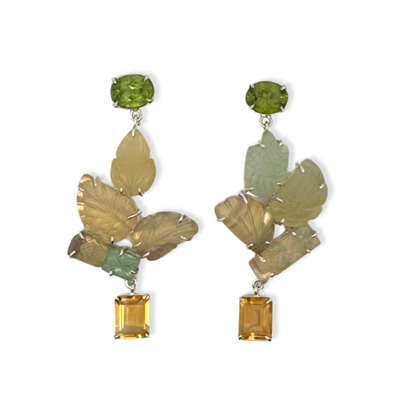 Design: Inspired by the quiet poetry of the natural world, the Spruce Earrings layer hand-carved fluorite in an organic, branch-like composition. Cool green and earthy golden tones echo the hues of sunlit foliage. A vivid peridot crowns the design, while a warm emerald cut citrine anchors the silhouette with a touch of luminous contrast.